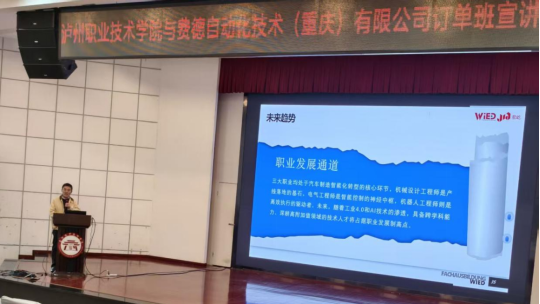 11月20日,费德自动化技术(重庆)有限公司在我校求实厅举行订单班组班宣讲会,2024级机电一体化技术、机械制造及自动化专业约200名学生参加宣讲会。