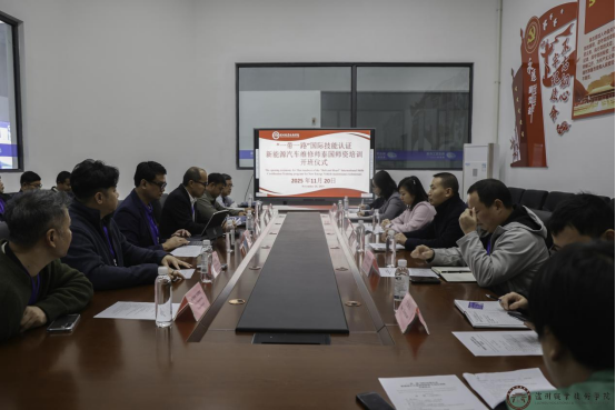 2025年11月20日,“一带一路”国际技能认证新能源汽车维修师泰国师资培训班开班仪式在泸州职业技术学院陈志军大师工作室隆重举行。泰国坦亚武里皇家理工大学培训学院院长阿农尼永蓬(Arnon Niyomphol)、叻丕府技术学院汽车学院主任孔桑查塔荣(Komsan Chatarung) 、MQ Square有限公司项目经理阿南特普纳荣(Amnaj Thepnarong)等12名参培教师到访,学校党委常委、副院长银盈及相关部门负责人出席仪式,智能制造与汽车工程学院副院长周丽娜主持。