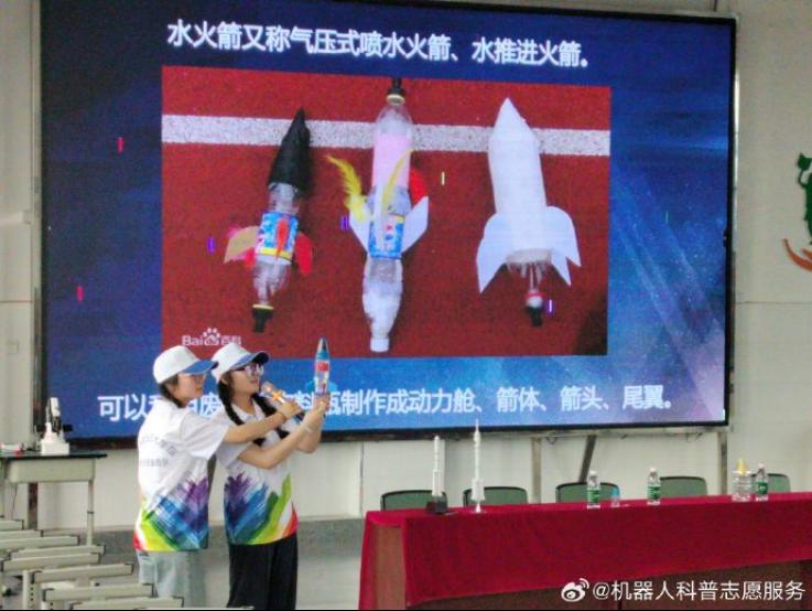 随后,大学生志愿者赖小琴、简元吉聚焦航天领域,以“理论与实践相结合”的形式讲解水火箭。赖小琴从火箭基本原理入手,详细介绍了水火箭的发射与安全事项。直观的模型与自制的发射装置,让遥远的航天知识变得触手可及。