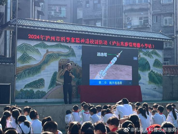为弘扬科学精神,激发青少年探索浩瀚宇宙的热情,5月22日,我校泸州职业技术学院科普志愿服务队、泸州市智能机器人科普基地成员郑钰琪博士走进泸州市龙马潭区兆雅镇明德学校,为该校200余名师生带来了一场题为“中国航天”的精彩科普讲座。