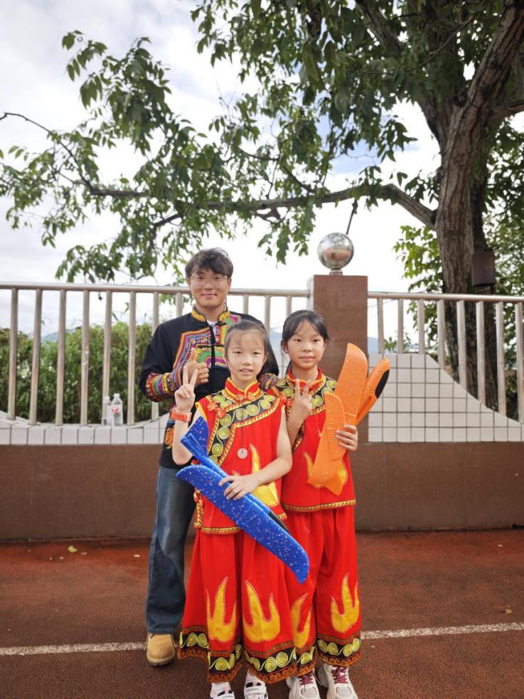 彝族大学生志愿者和彝族小同学合个影
