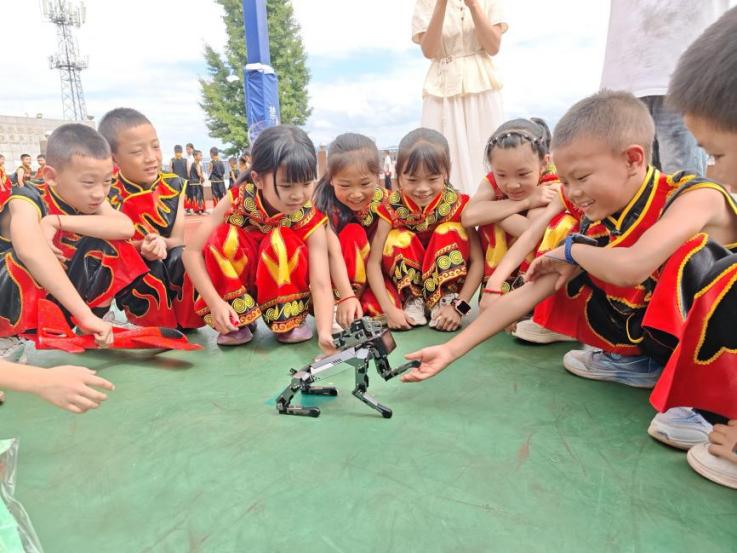 室外活动将现场气氛推向高潮。在志愿者们的引导下,孩子们亲手参与水火箭的制作与发射,欢呼声随着火箭升空此起彼伏;无人机飞行展示与智能机器狗操作体验,更让同学们近距离感受到现代科技的无限魅力。整个校园洋溢着探索与欢乐的氛围。